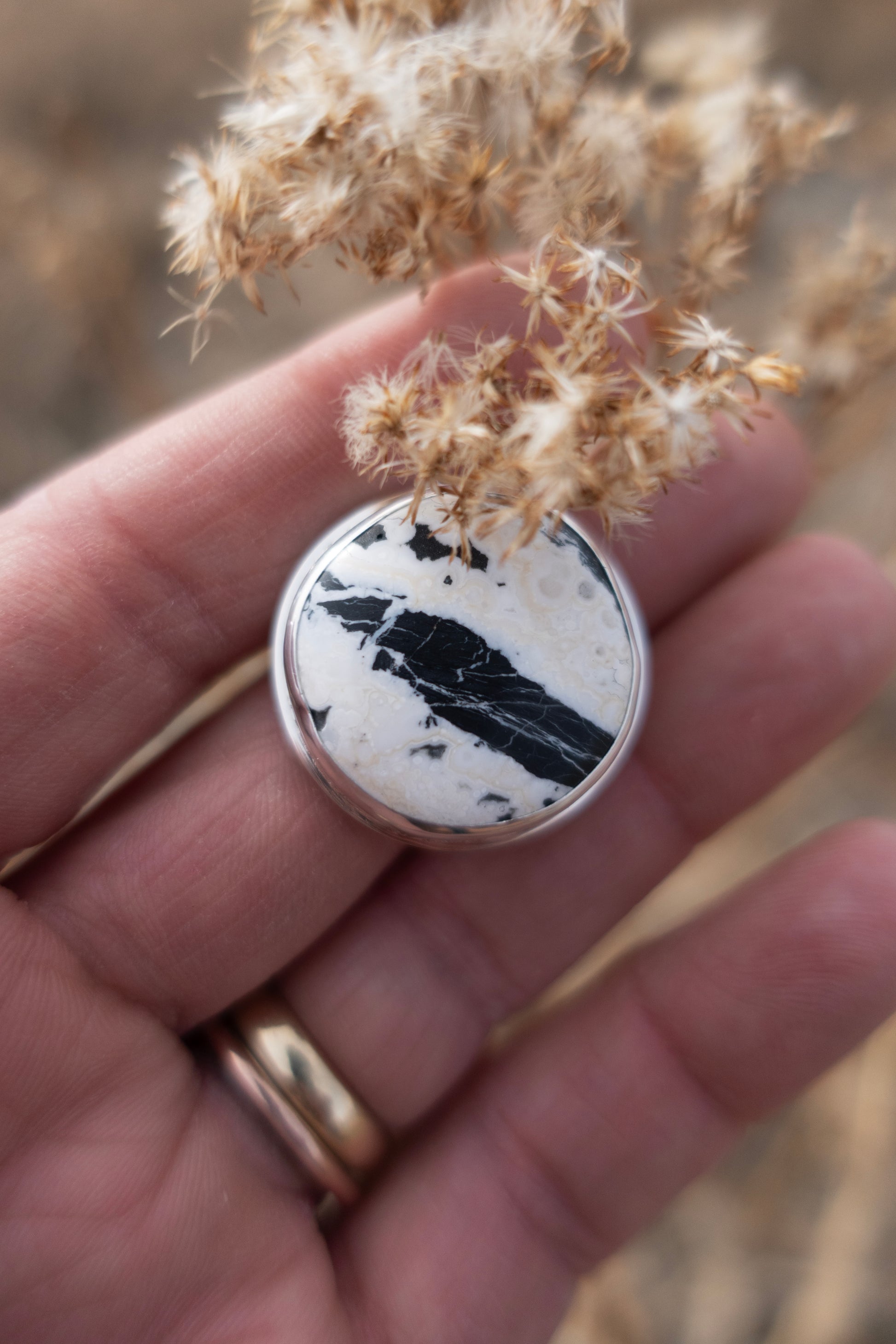 Big and bold! This large round White Buffalo Turquoise ring is a unique and hefty statement piece worthy of any wearable art collection. Nearly 30 mm across with a sturdy 8mm wide band, this ring will fit like a 6.5-6.75. Solid sterling silver construction with a bright fine silver bezel. Polished to a clean mirror finish and stamped .925. White Buffalo Turquoise is desirable for its unique look and increasing rarity. This ring is a treasure for anyone who values quality artisan handcrafted silver jewelry and unique turquoise.