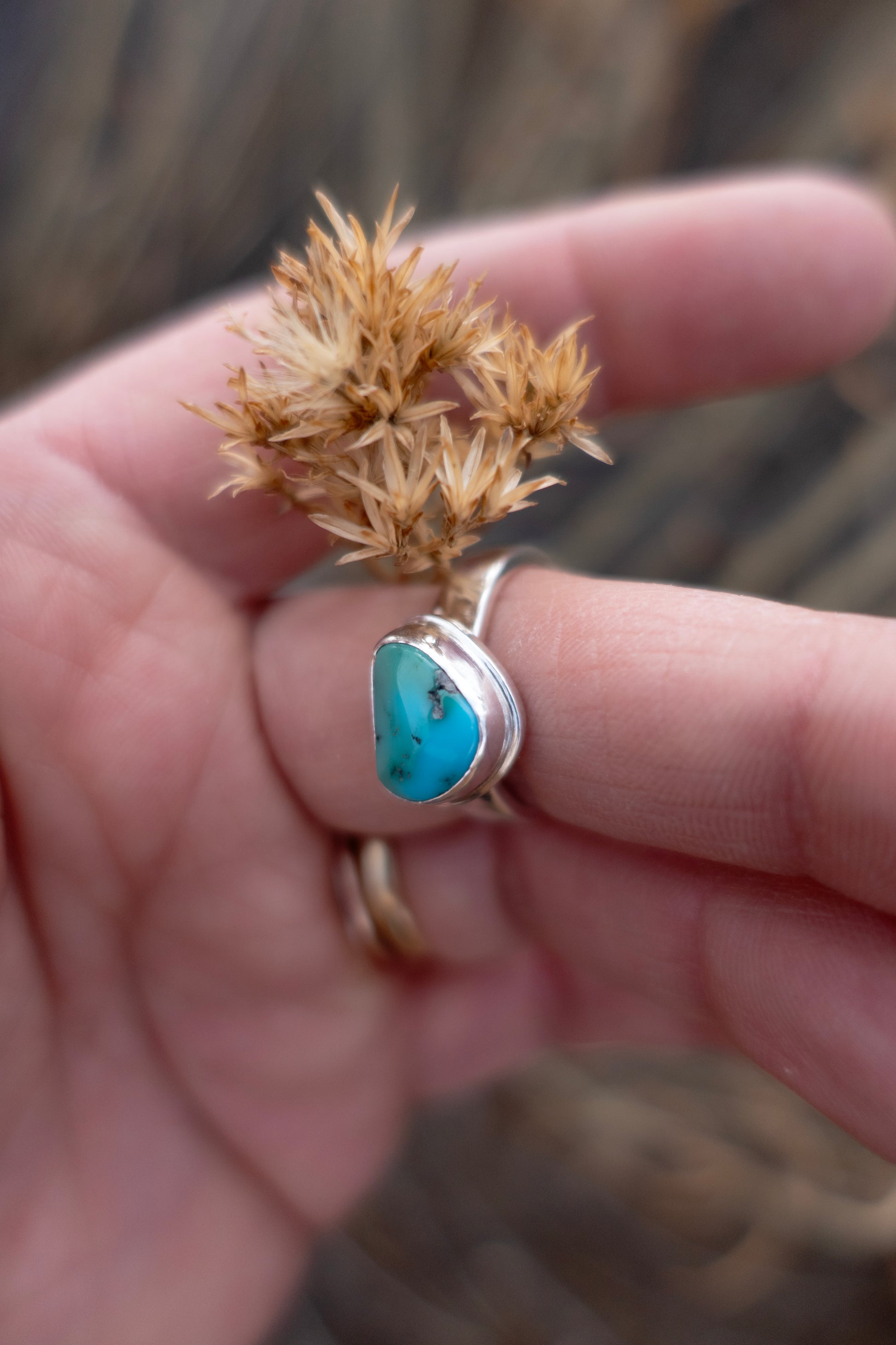 This funky blue and green cut of Royston Turquoise is set in a hefty, solid sterling silver setting with a shiny .999 bezel. This cabochon is triangular and raised, like a little stone mountain - a beautiful reminder of the peaks that you have climbed and the strength that you carry within you. Polished smooth and bright for comfort and shine. Made by hand to adorn you.