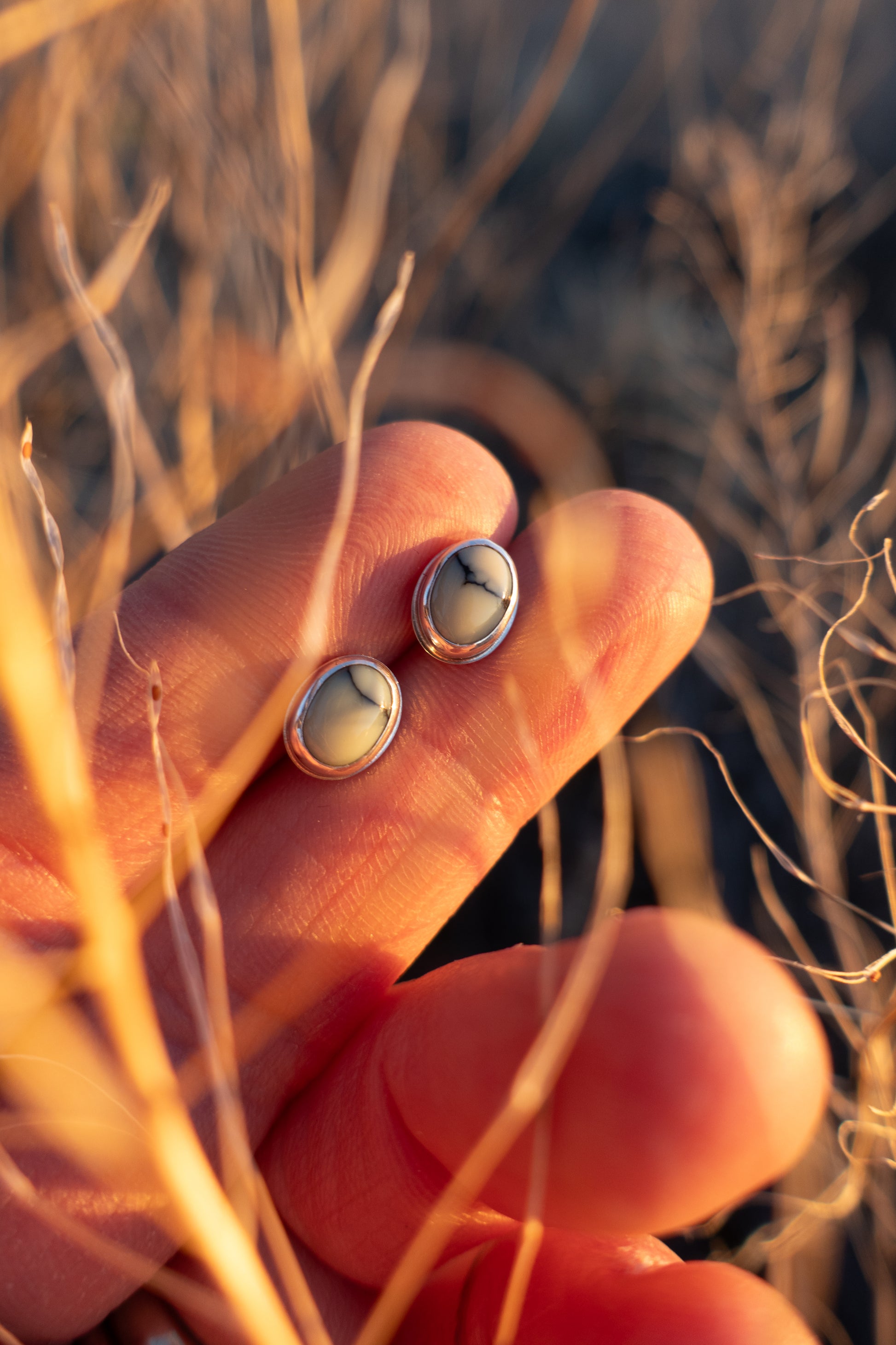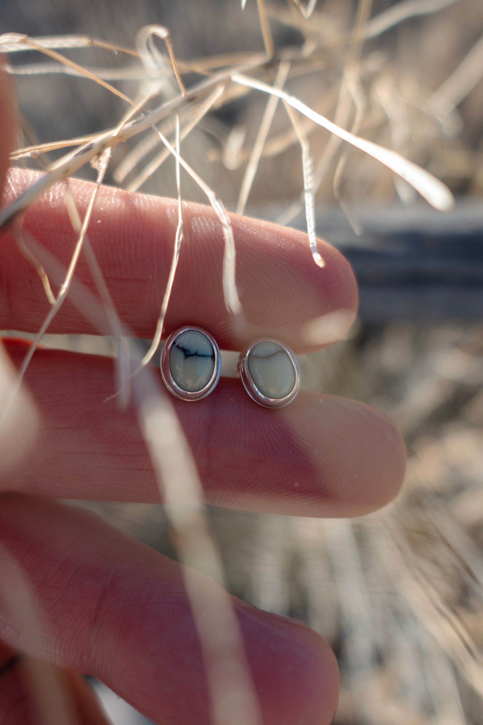 These stunning little New Lander studs are the most beautiful hue of sage green. Mined in Northern Nevada, this premium variscite is prized for its unique coloring and dark delicate webbed matrix. Hand fabricated in a simple sterling silver setting with a bright fine silver bezel, sterling posts and tarnish resistant rhodium plated sterling backs. Truly a one of a kind pair of fine wearable art that celebrates the natural gifts of the Earth.