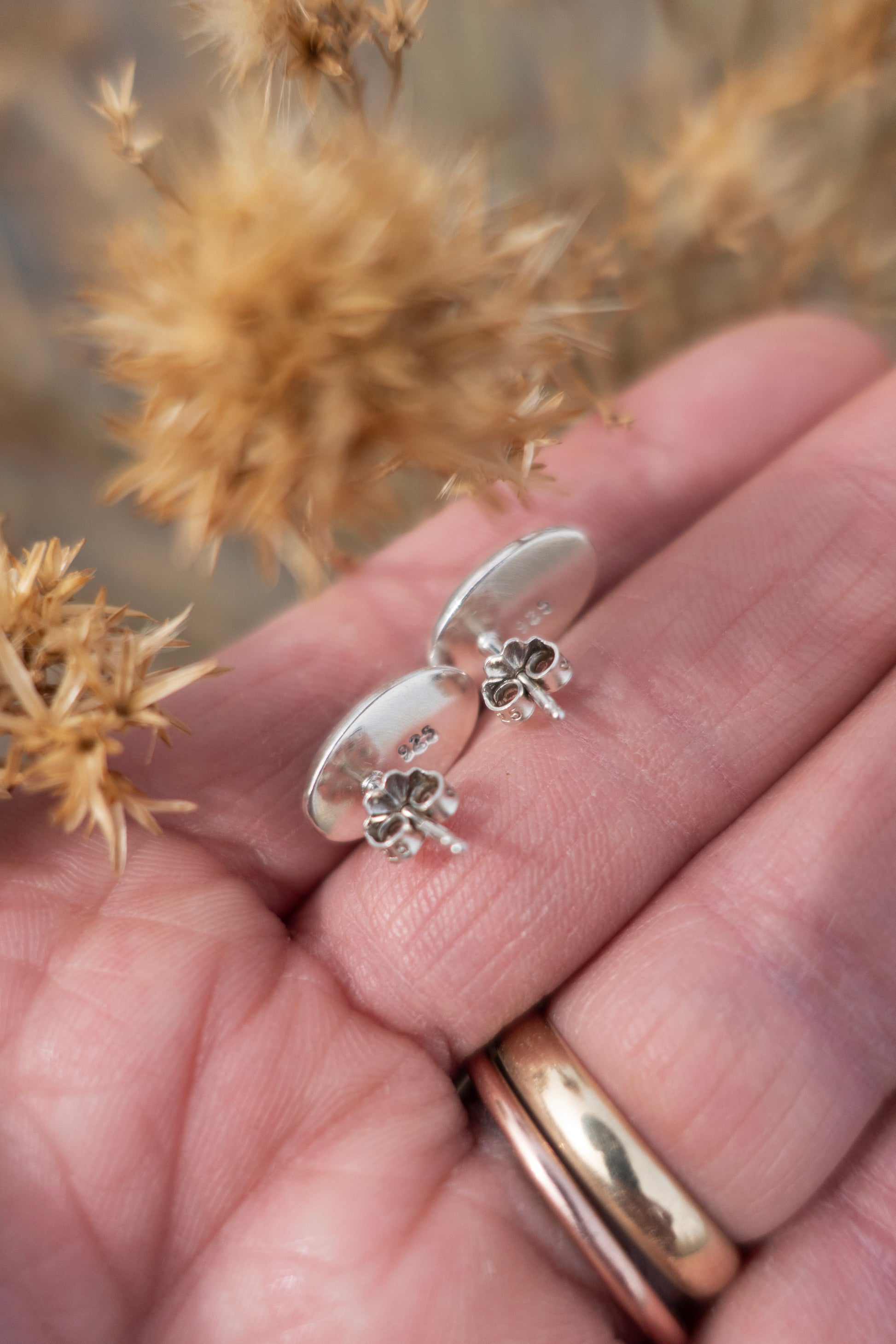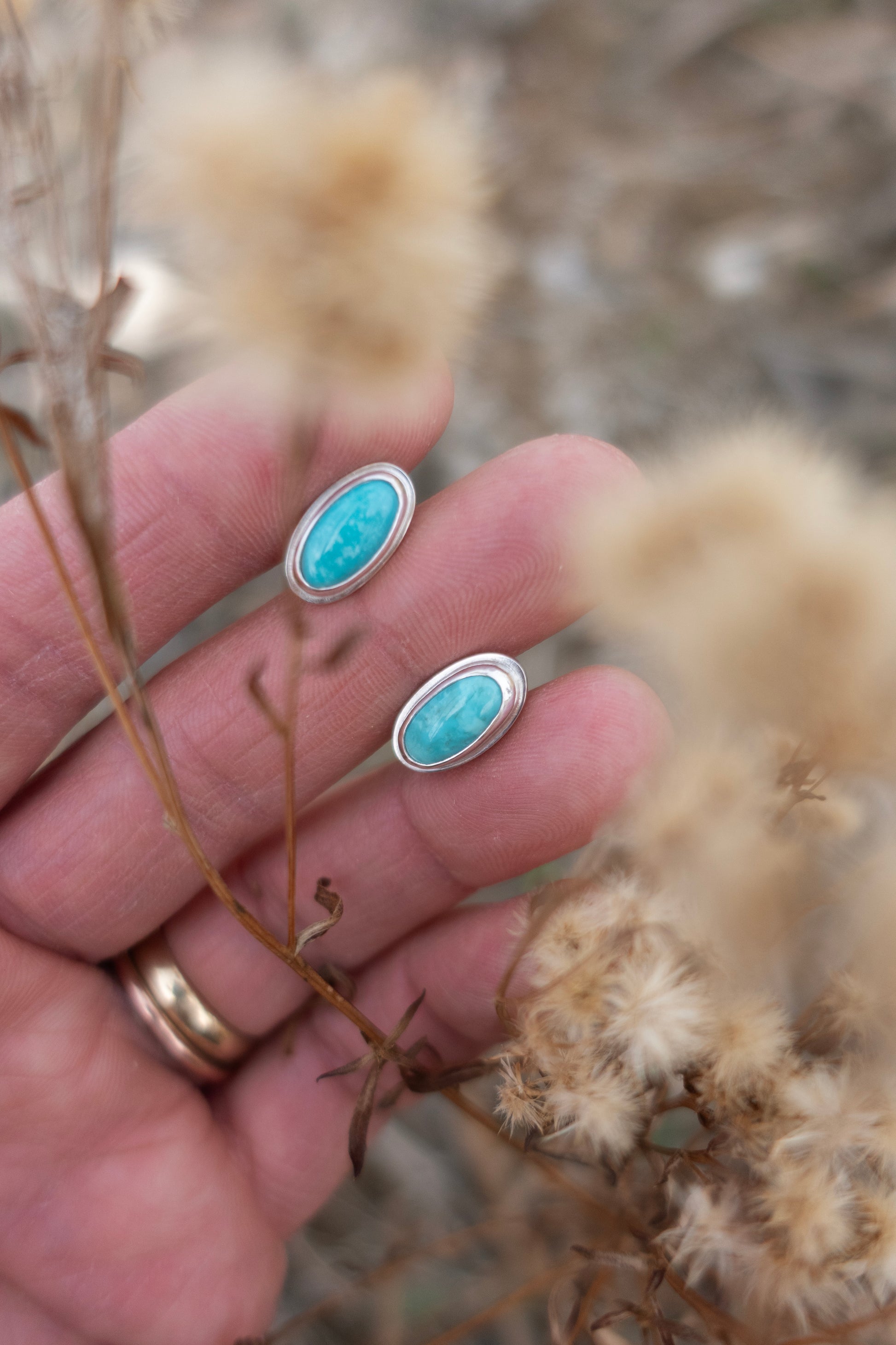 Bright, cheerful oval Kingman Turquoise stud earrings. Lightweight but sturdy. Stamped .925 sterling silver setting with fine silver bezels and sterling silver posts and backs. Slight color variety makes them sisters not twins. Handmade with high shine polish for timeless style and everyday comfort.