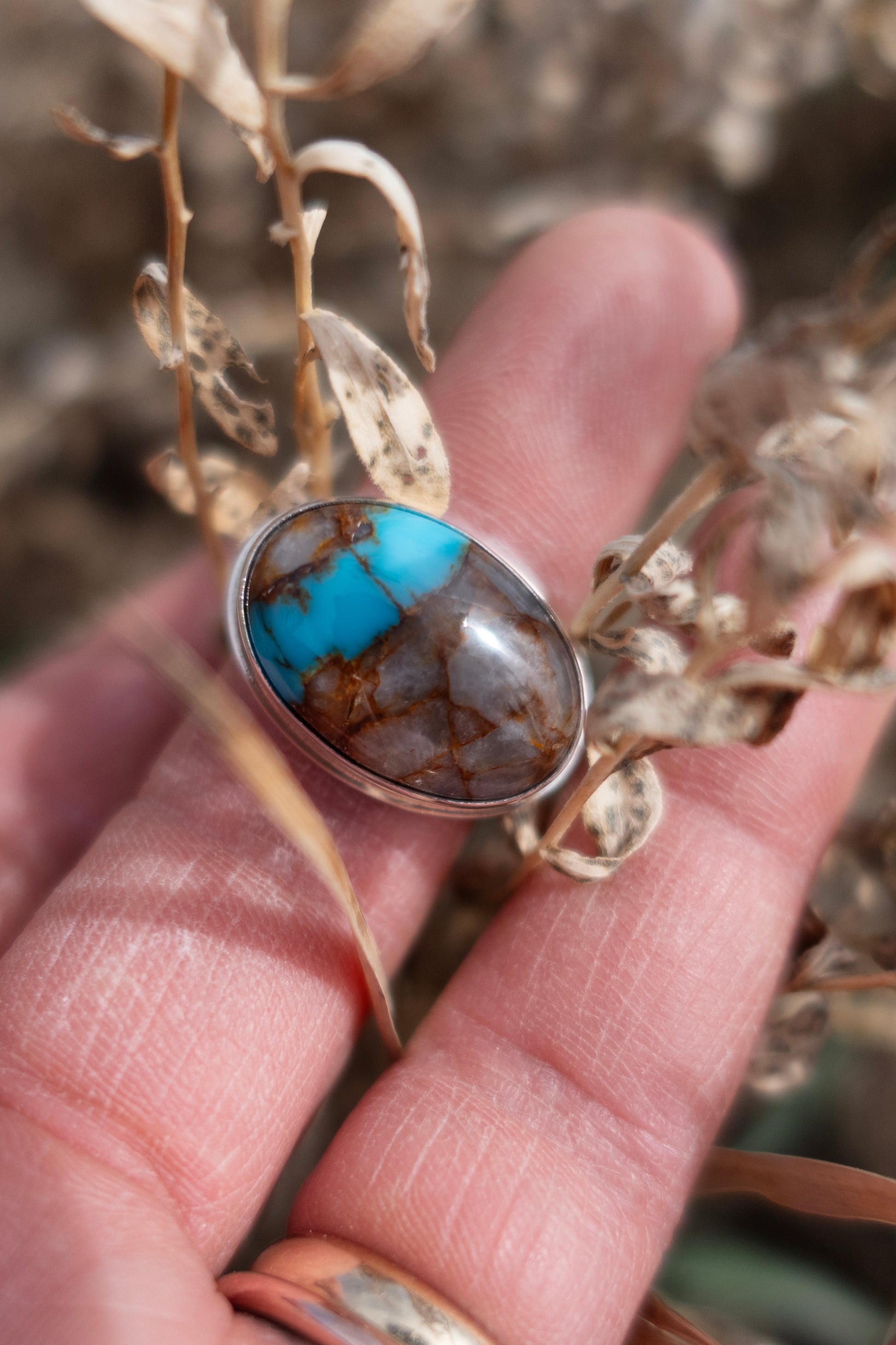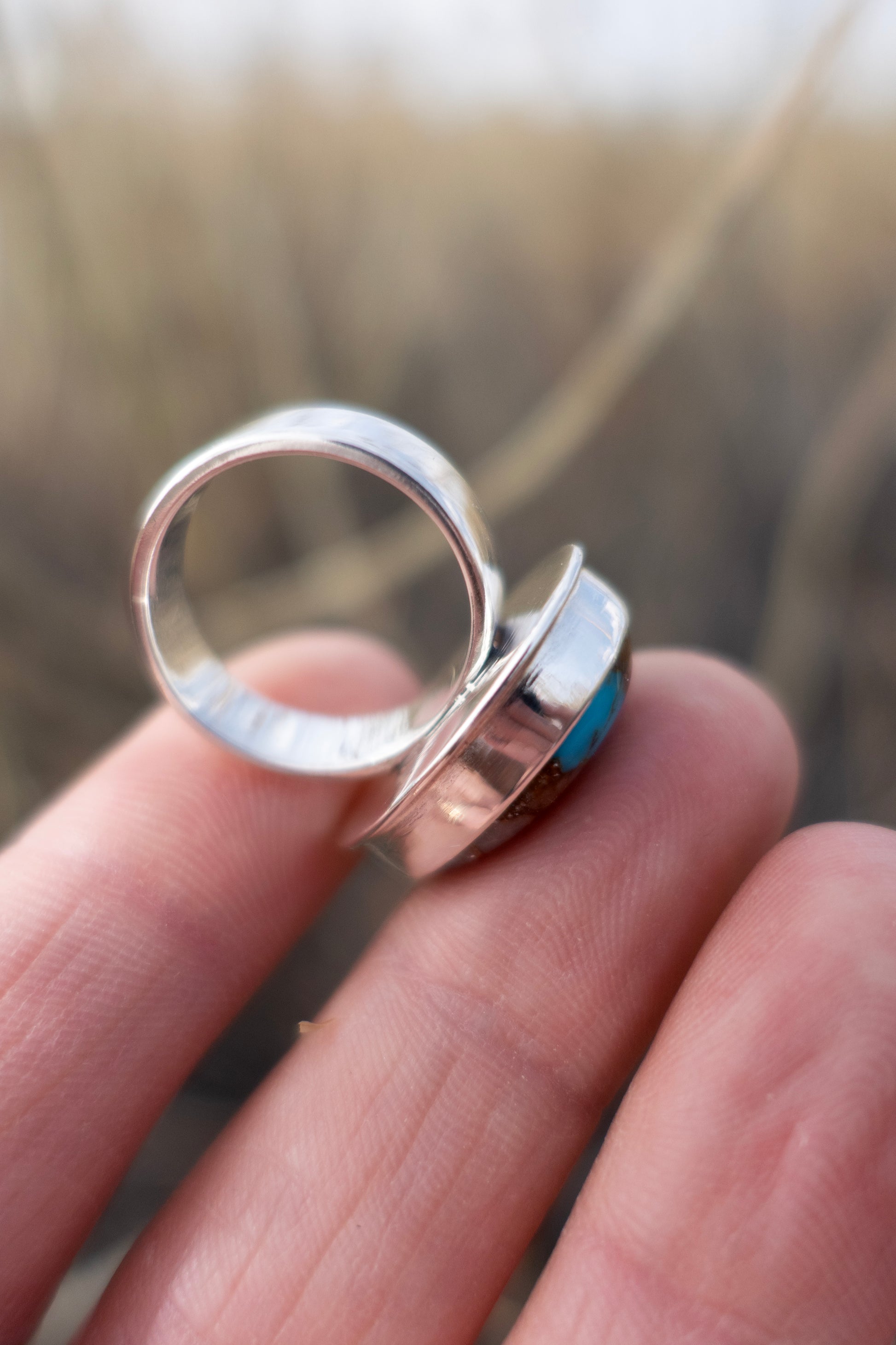 A beautiful Royston “River” Ribbon Turquoise ring - a reminder that you carry the strength of the river within you, wherever you flow. A brilliant streak of blue cuts across the earthy host stone the way a rushing current carves through rocky bank. Set in a bright fine silver bezel and grounded by a solid 6mm wide sterling silver band. It has a hefty, solid presence. Due to the thickness of the band, this size 7.5 ring will fit a most comfortably as a 7-7.25.